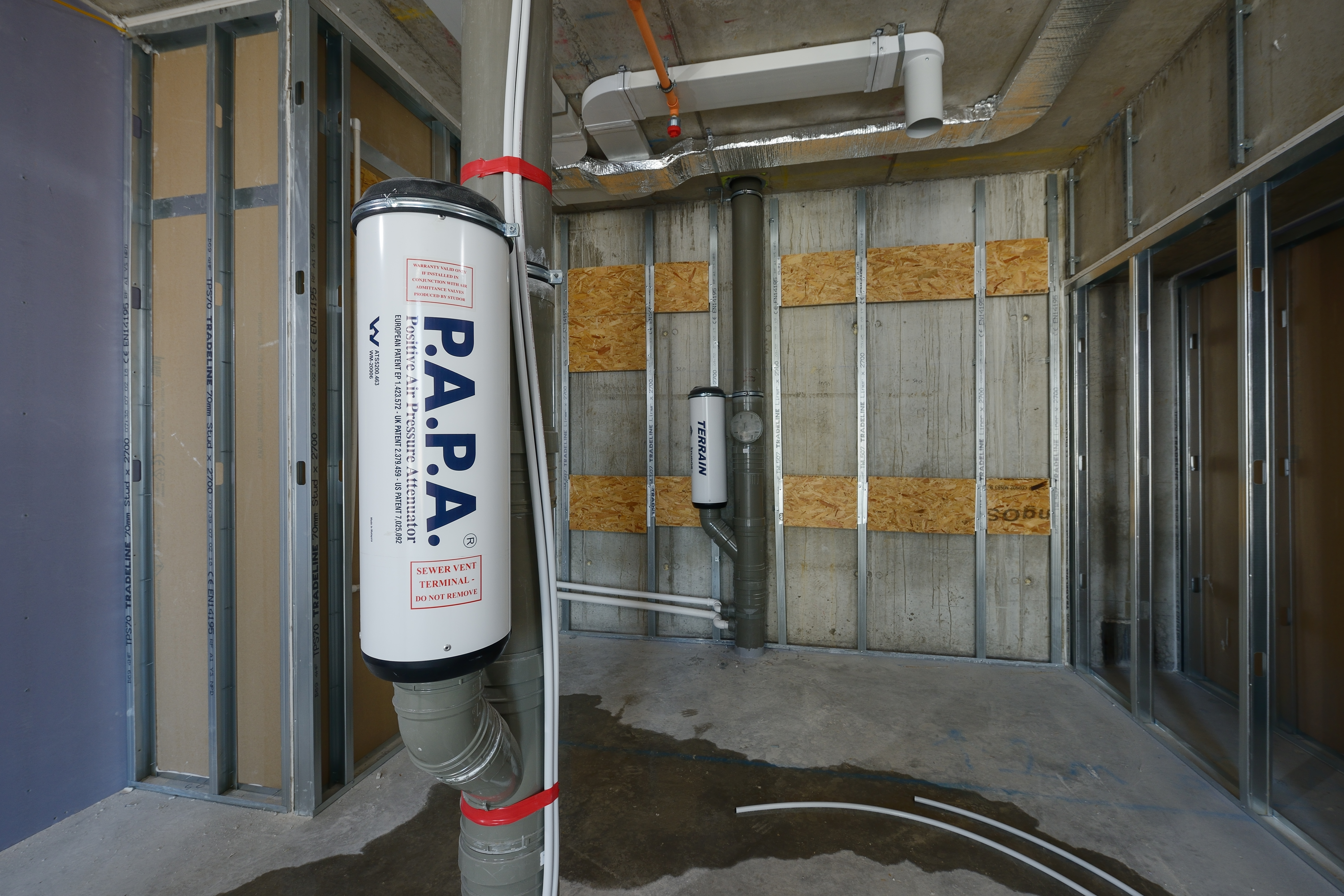 Positive pressure builds when water changes direction quickly, and if it is not managed correctly, the pressure can push air through traps and joints, releasing foul gases. Traditional solutions like secondary vent stacks can help to manage positive air pressure, but they need careful sizing and placement. Advanced solutions, such as the Terrain Positive Air Pressure Attenuator (P.A.P.A®), which is a large reactive bladder that is placed at specific points within the drainage pipework, counter this by absorbing positive pressure surges and releasing the air slowly and safely, thereby maintaining the system’s equilibrium.