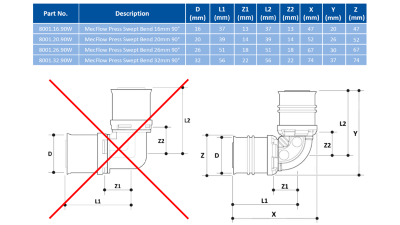 The following MecFlow Press 90° PPSU Knuckle Bends have been replaced with Swept Bends. This change improves the flow characteristics of the product, and the system that they're installed into, reducing the pressure drop caused by resistance within the fitting.